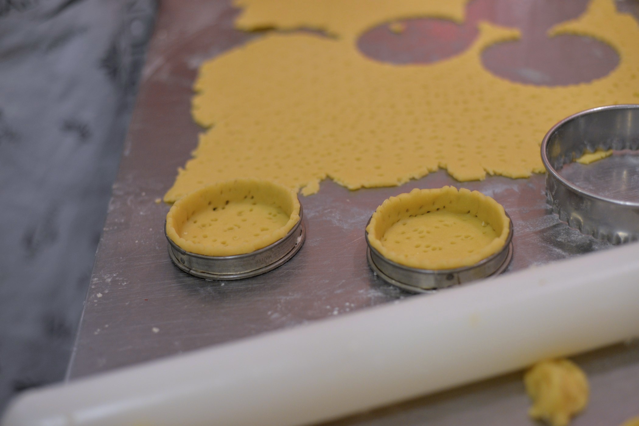 Hotové těsto zabalíme do fólie a v lednici ho necháme alespoň jednu hodinu odležet. Z odleželého těsta vyválíme plát tlustý 2 až 3 mm. Vyválené těsto propícháme vidličkou, aby z těsta při pečení odešel vzduch.