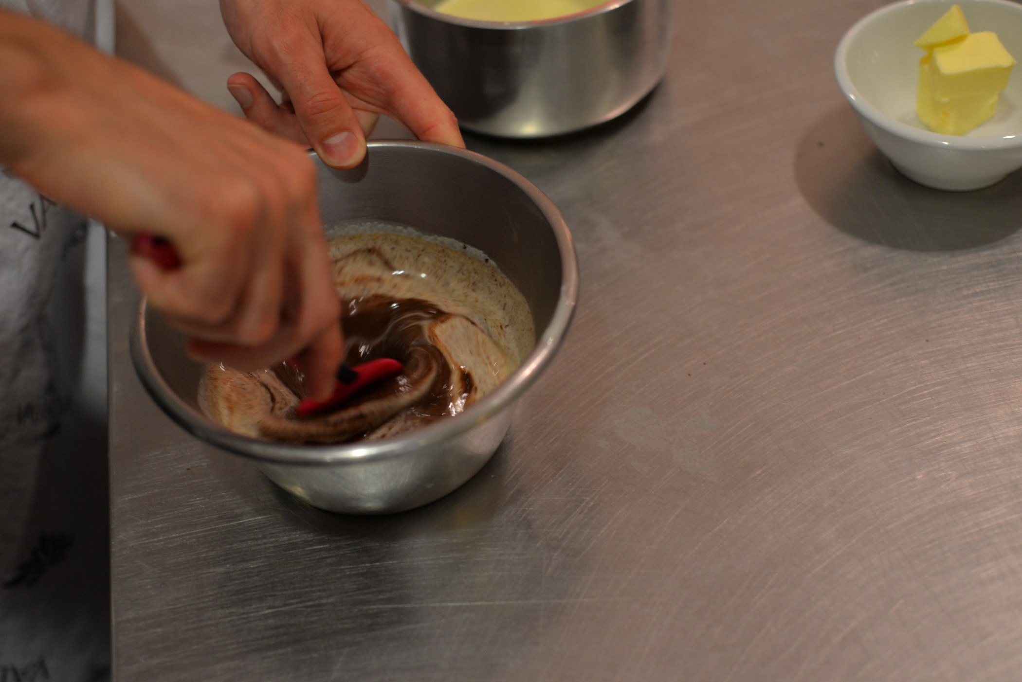 Do mísy nasypeme cukr moučku, mandlovou mouku, sůl, hladkou mouku (pouze 60 gramů), přidáme máslo o pokojové teplotě a vejce. Všechny ingredience dobře smícháme.