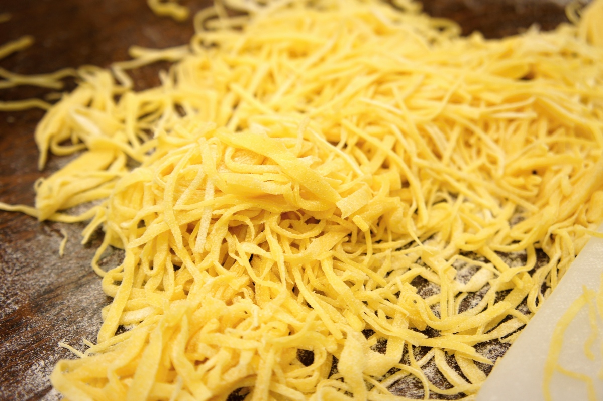 Vzniknou tenké a nepravidelné domácí nudle, které lehce promícháme s moukou, aby se neslepily. Proházíme je jako seno a necháme proschnout na vále. Pak je můžeme schovat do dózy a použít, kdy je potřeba nebo rovnou vařit.