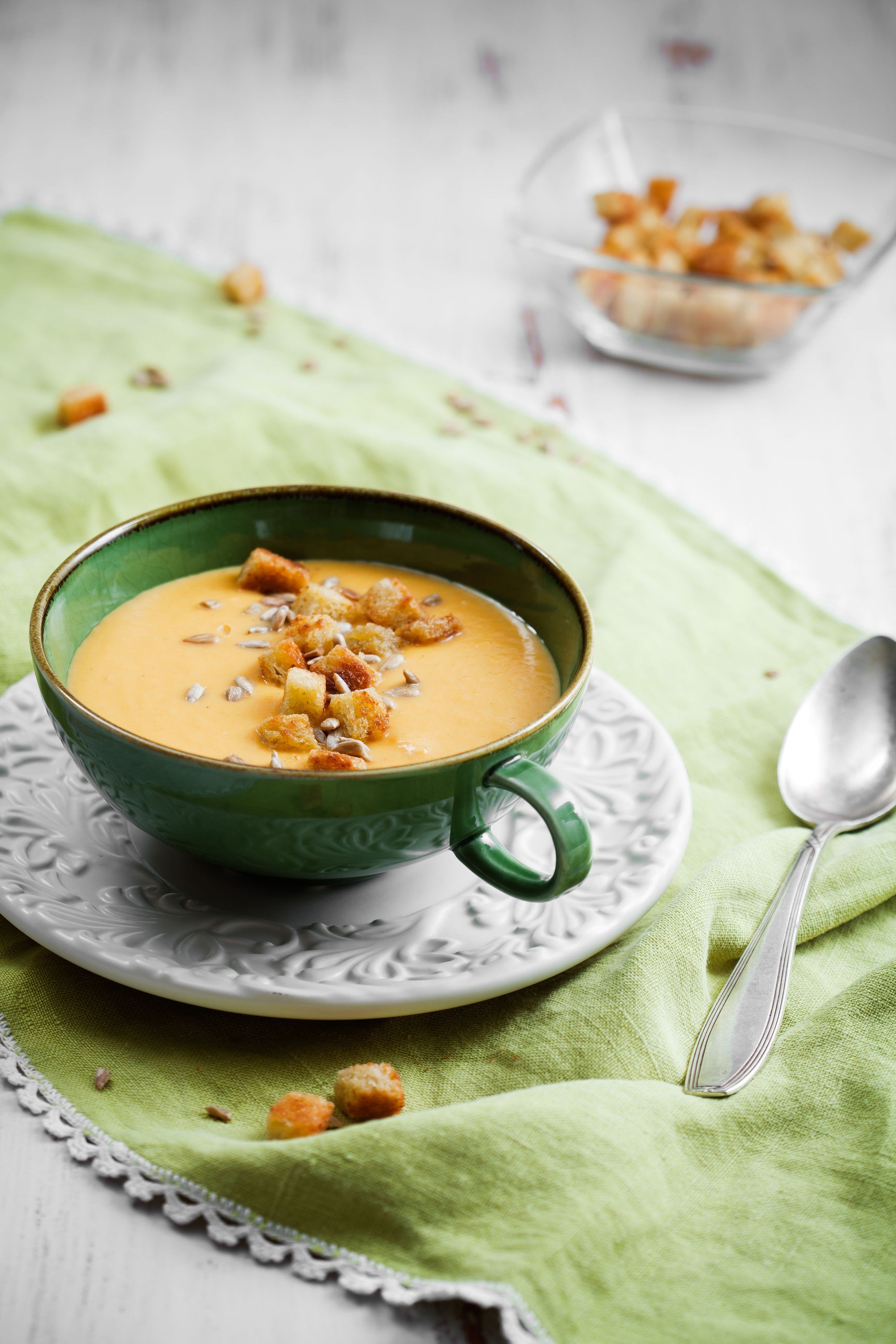 U krutonů to je něco jiného. Krutony jsou speciální příloha, která je charakteristická především tím, že je křupavá. Proto se opékají nebo smaží z minimálně jednoho dne starého pečiva, aby opravdu dosáhly takové křehkosti, kterou od nich očekáváme. Do polévky je vkládáme dodatečně, aby zvláčnily co nejkratší dobu před tím, než ji budeme jíst.