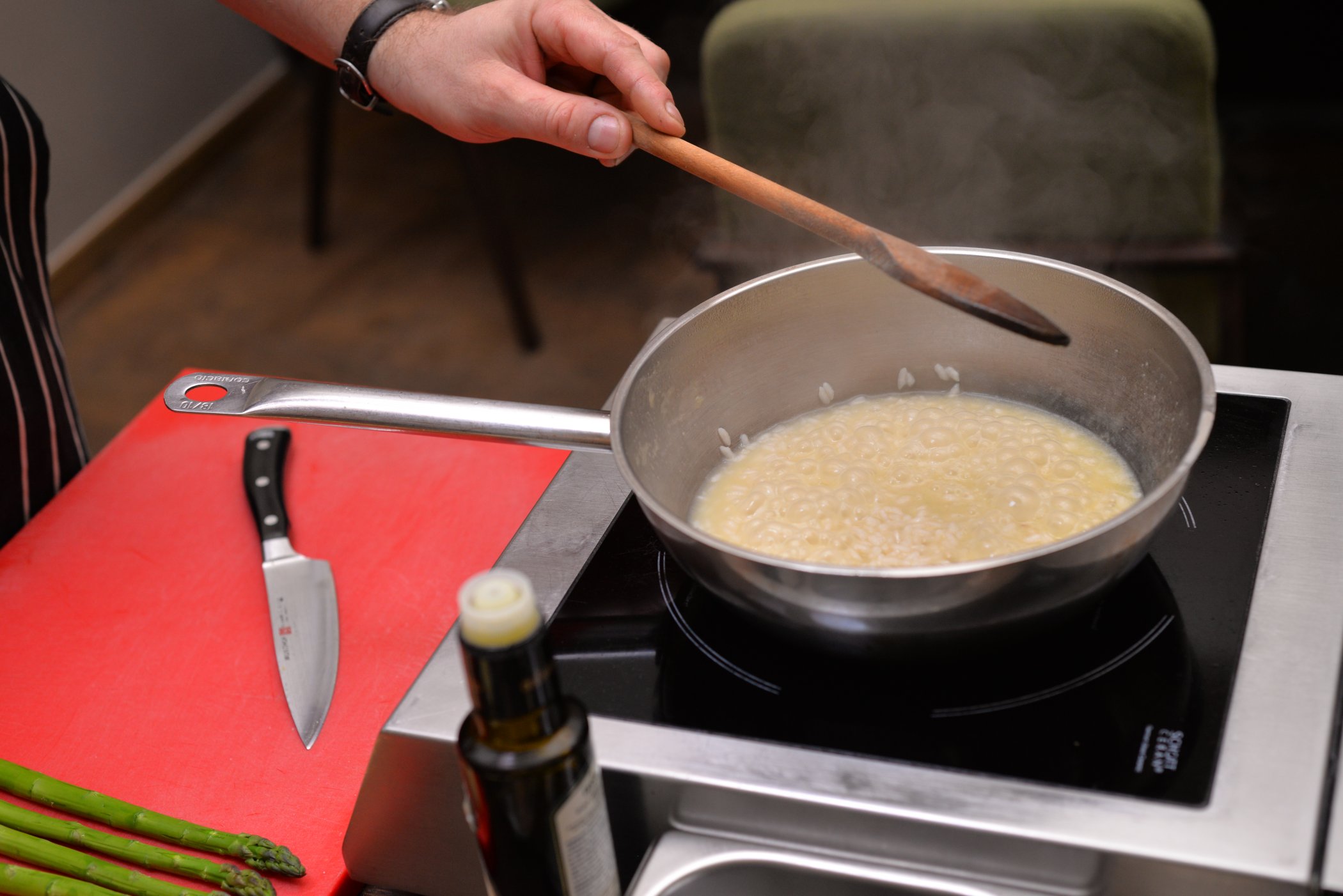 V malém kastrolu si zredukujeme bílé víno. Odvaří se tím alkohol a chuť bude intenzivnější. V kastrolu si ohřejeme olivový olej a necháme na něm zpěnit (zesklovatět) rýži. Může být předvařená, ale není to podmínka. Ihned ji zalijeme teplým zeleninovým vývarem nebo vodou a přidáme odvařené bílé víno. Rýži necháme nasát tekutinu.