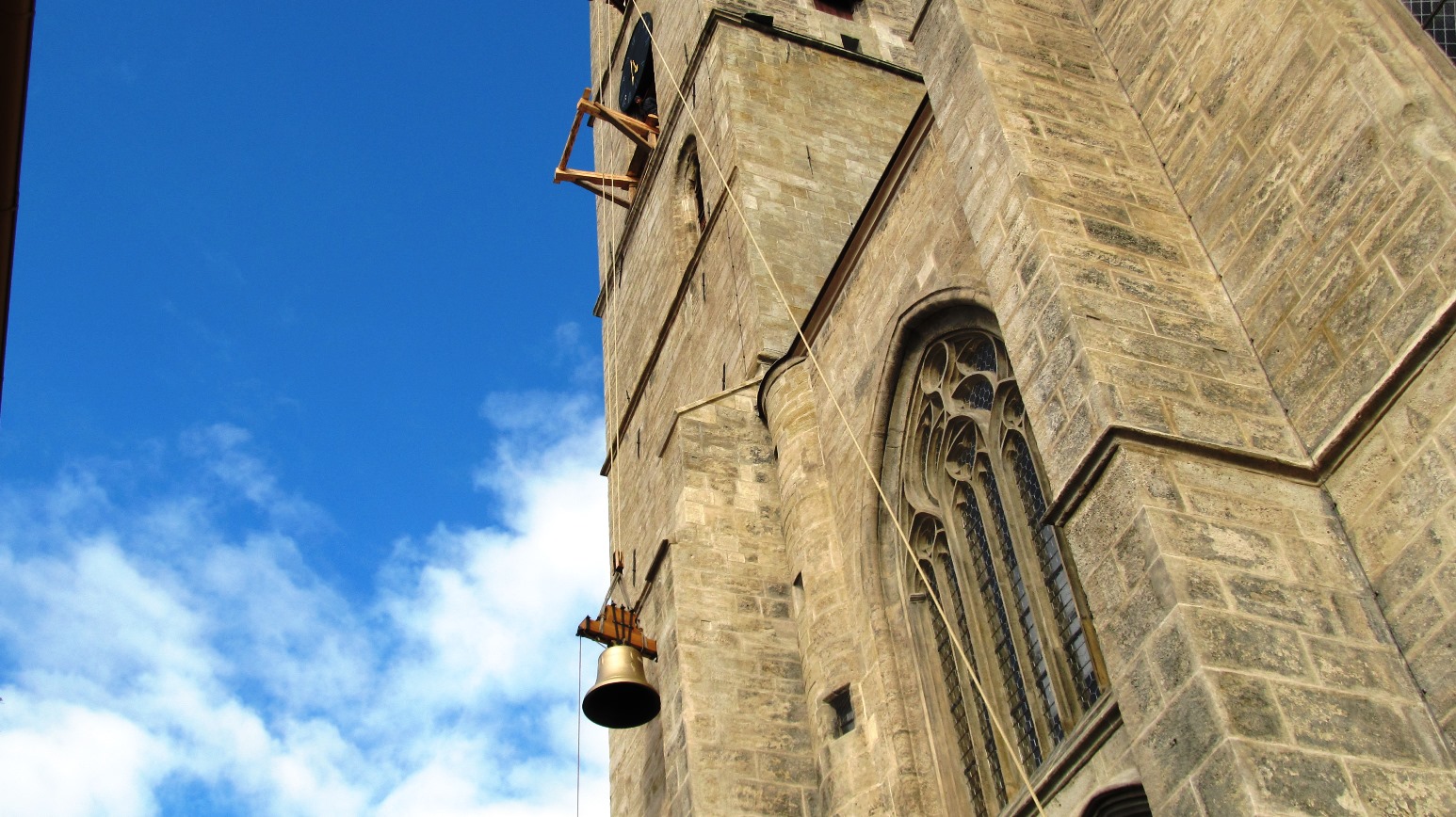 Kostel svatého Jakuba v Kutné Hoře má po tři čtvrtě století znovu svůj zvon. Do zvonice ho řemeslníci tahali za pomoci dřevěné konstrukce a vrátku, tedy středověkou metodou.