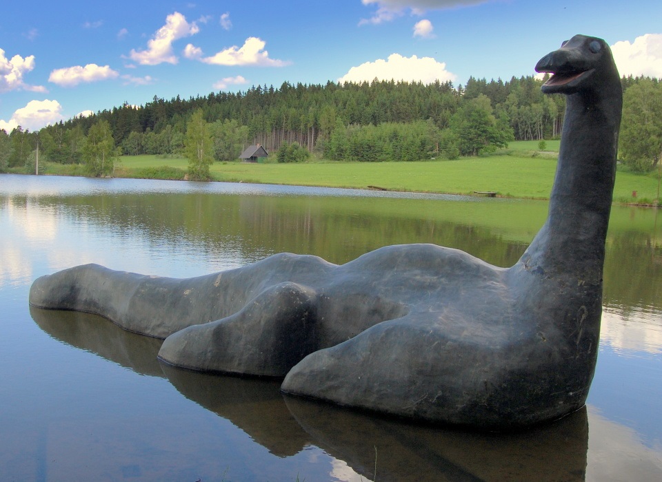 Pokud někdy pojedete na Vysočině přes Horní Krupou směrem na Zálesí, můžete utrpět menší šok. Po jezeře tam totiž pluje brontosaurus! Tedy pardon, místní Lochneska, které se ovšem vůbec nemusíte bát. Laminátová barevná atrakce je absolutně neškodná.