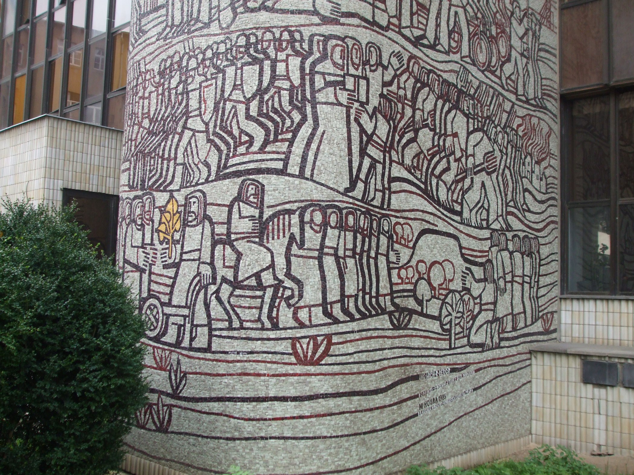 Na samém vrcholu mozaikového sloupu se vznášejí postavy kosmonautů a mírové holubice. Miroslav Houra to neměl s výtvarným návrhem jednoduché. Neprošel jeho návrh na ústřední hodiny v podobě orloje ani na motiv rodinného domu. Místo toho se v centru mozaiky musel objevit citát z ústavy z roku 1960 o tom, že veškerá moc patří do rukou pracujícího lidu.