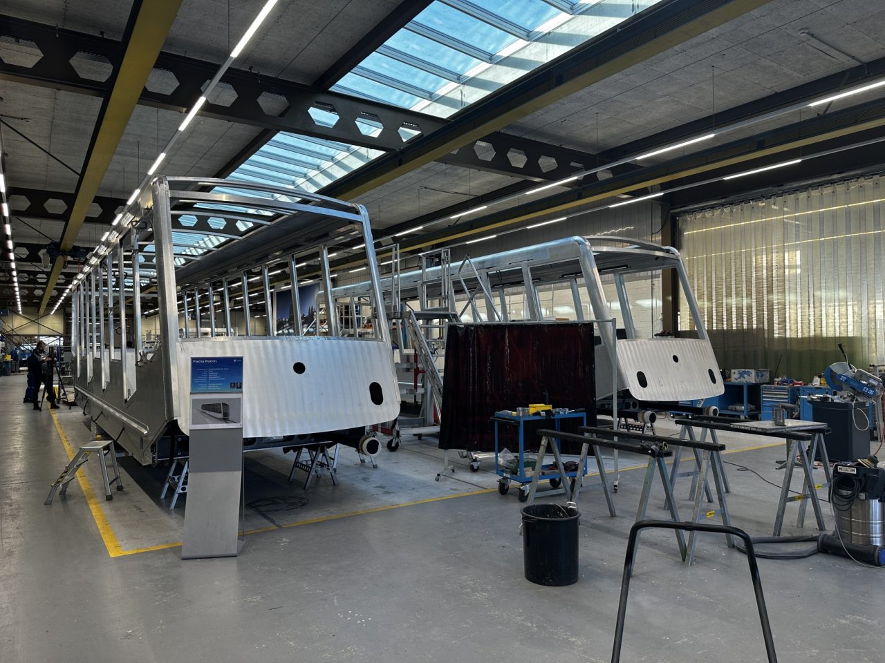 „Vozy pro petřínskou lanovku jsou v tuto chvíli ve fázi hrubé stavby. Přijeli jsme se na ně podívat ve chvíli, kdy budou dostávat finální povrchy a cestovat do lakovny,“ popisuje reportér.