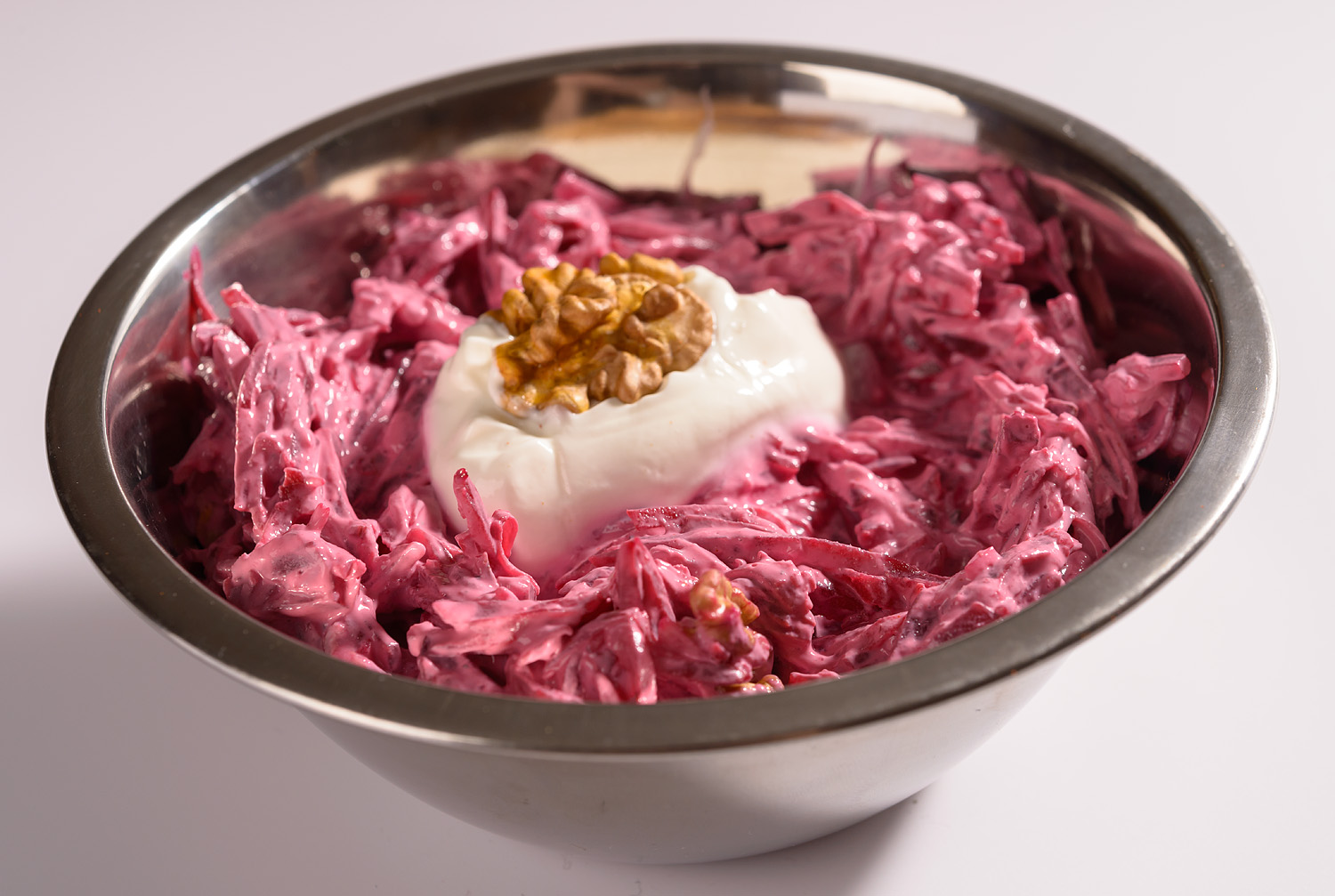 Vařenou a oloupanou červenou řepu nastrouháme na jemnější nudličky, přidáme utřený česnek, jádra ořechů, osolíme, opepříme a dobře promícháme s kysanou smetanou. V chladu necháme chvilku proležet.