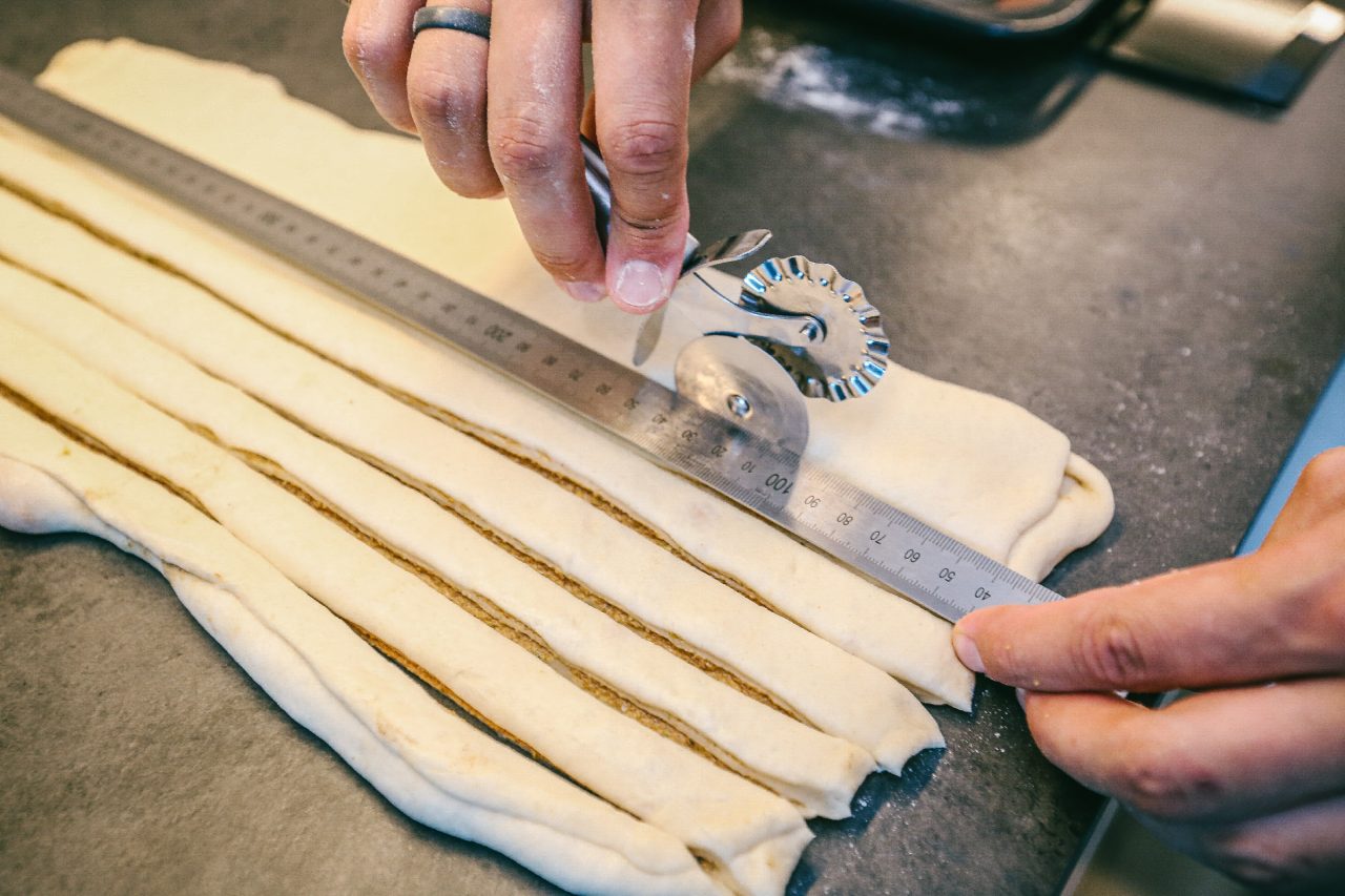 Nožem nebo rádýlkem rozkrájíme složené těsto podélně na pruhy o šířce zhruba dva centimetry. Každý jednotlivý pruh smotáme přes tři prsty. Měli bychom ho zvládnout dvakrát obtočit. Zbytkem pruhu uzavřeme balíček ze strany. Jako když motáme provázek nebo nějaké klubíčko. Vznikne hezký uzlík, který stranou položíme na plech vyložený pečicím papírem.