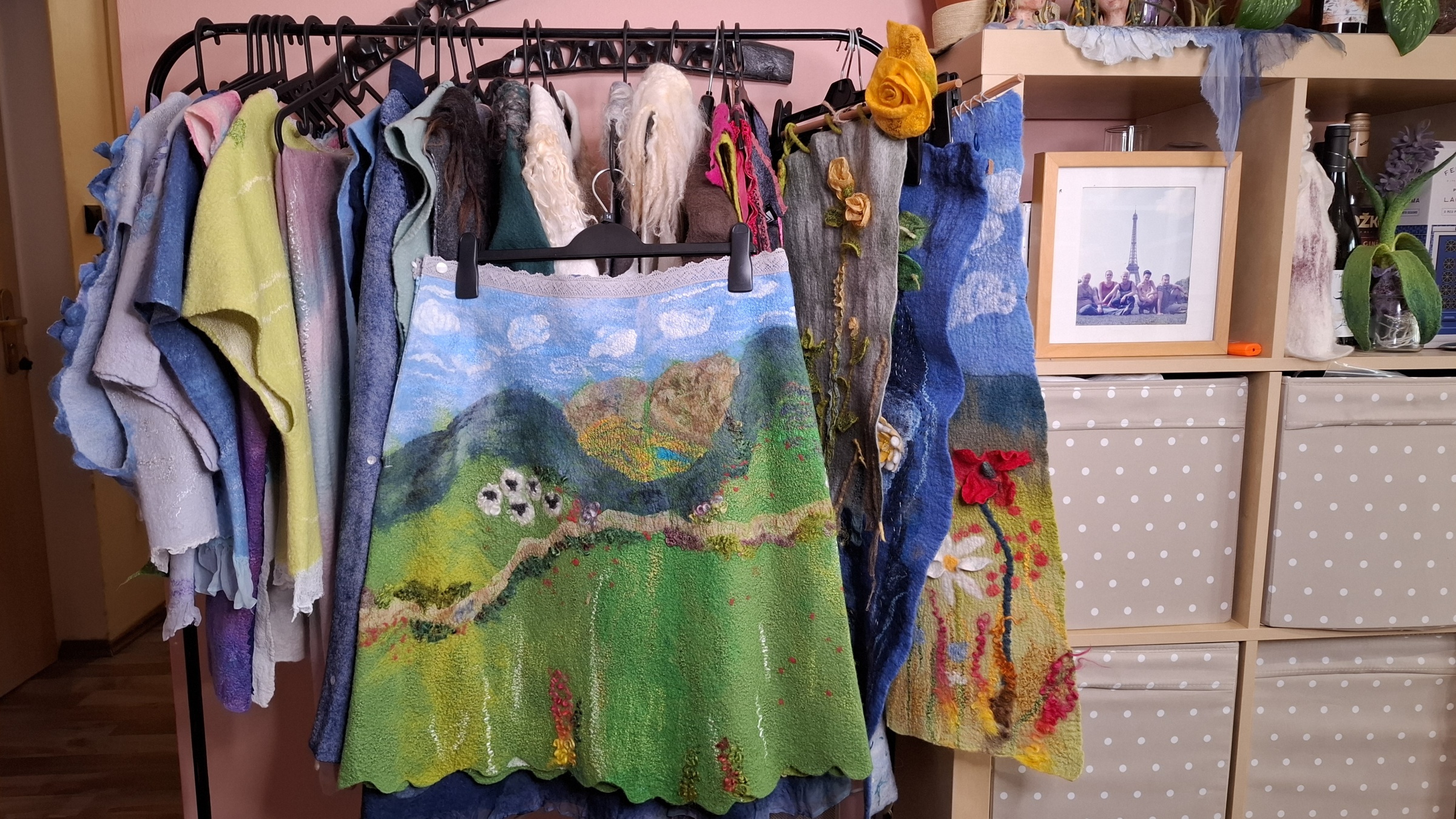 Technikou plstění v podstatě nelze vyrobit dva naprosto stejné kusy. Samotné navrhování oděvů a doplňků je pro paní Vodrážkovou dlouhý tvůrčí proces. Na samém začátku je samozřejmě papír a tužka a první nápady. Ty ale iniciují další...takže většinou s přípravou menšího doplňku vzniká celý komplet. Ostatně o své práci říká: „Je to vlastně taková alchymie a často vede k překvapivým výsledkům“.