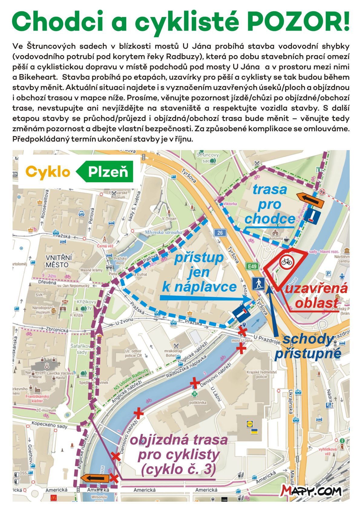 Protože je stavba poblíž náplavky, nechala Vodárna Plzeň postavit k bezpečnému sestupu dřevěnou bezbariérovou lávku vhodnou pro chodce, cyklisty, hendikepované nebo maminky s kočárky. Stavba si nevyžádá omezení pro automobilovou dopravu, pro cyklisty je navržena objízdná trasa Štruncovými sady. Vše je na místě označeno informačními značkami.